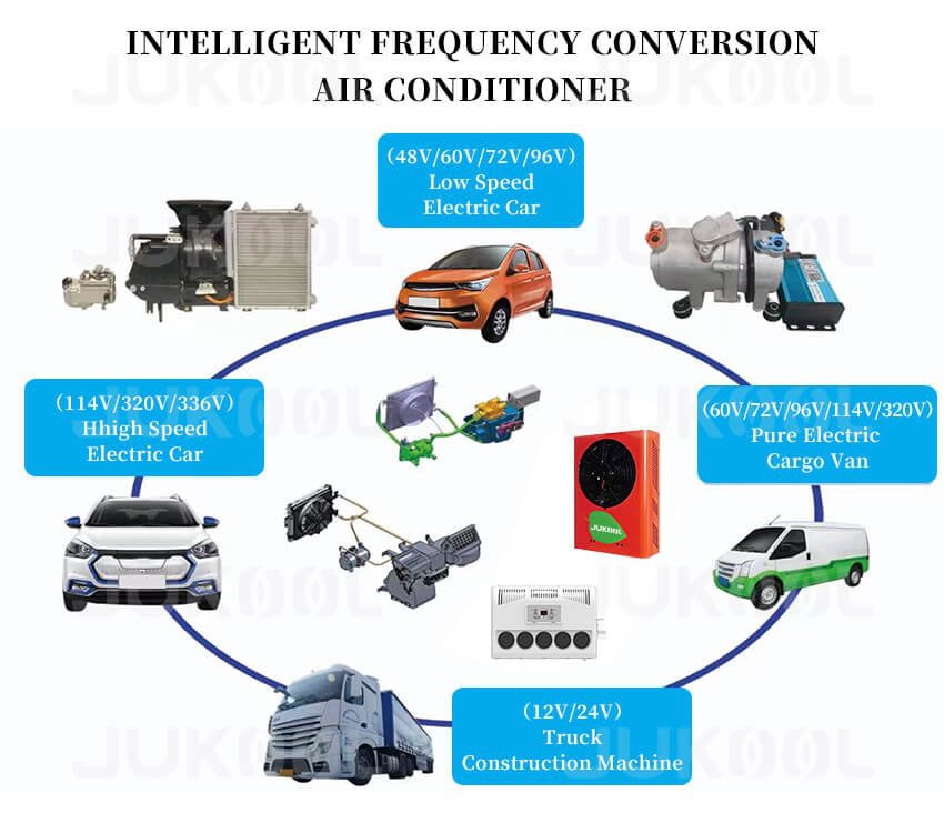 Los automóviles eléctricos y el aire acondicionado JUKOOL tienen diferentes modelos y tipos de condensadores, interruptores de aire acondicionado, compresor eléctrico y conjunto de evaporador HVAC como opciones.